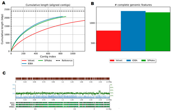 Efficiency of the de novo assembly of the Ornithobacterium rhinotracheale (ORT) genome obtained from the clinical sample from short-read datasets using the Velvet, SPAdes, and IDBA-UD genome assemblers. (A) Comparison of cumulative length of aligned contigs generated by Velvet, Spades, and IDBA-UD assemblers for clinical samples mapped to the ORT-UMN 88 (GenBank acc. no CP006828) reference genome sequence. (B) Comparison of complete genomic futures obtained by Velvet, SPAdes, and IDBA-UD de novo assemblers mapped along the ORT-UMN 88 reference genome. (C) The contig alignment viewer for Velvet, IDBA-UD, and SPAdes assemblies in the dataset. Contigs aligned to the ORT-UMN 88 (GenBank acc. no CP006828) reference genome sequence. From top to bottom: assembly to reference genome with gaps, detailed read coverage and GC content, and assembly overview. Correct contigs are colored in green and blue, whereas misassemblies are colored in red and orange.