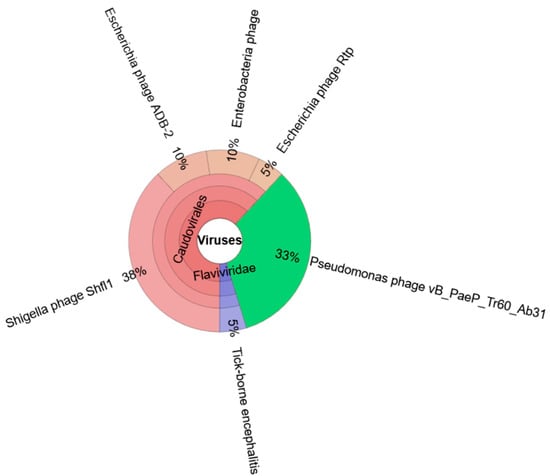 Taxonomic distribution of 72 de novo-assembled contigs (237,435 bp in total), selected based on size (minimum contig length of 1500 bp) and coverage (minimum contig coverage of 1000 bp) classified by the Kraken metagenomics tool using the viral database installed on a Galaxy platform (Galaxy Version 1.3.0). A total of 21 contigs were assigned to taxonomic labels based on k-mers species identification. Out of the total contigs used for analysis, eight were assigned as Shigella phage ShFl1 type and seven contigs were assigned as Pseudomonas phage type.