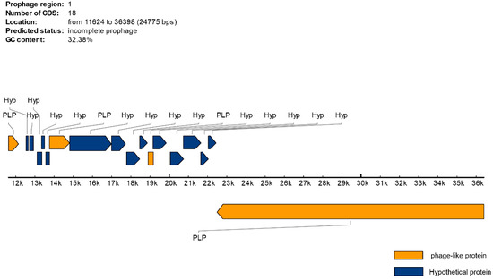 Phage-related proteins identified as incomplete prophages by PHAST are shown in Figure 5. The number of hypothetical proteins in the region without a match in the database was nine.