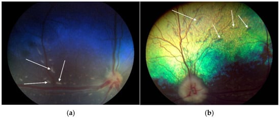 Clinical eye examination record using Aurora fundus camera (Optomed, Finland). (a) Retinal fold in a puppy, (b) multifocal form of retinal dysplasia in an adult dog. Arrows highlight clinical manifestations of each form (source: Pavol Zubrický).