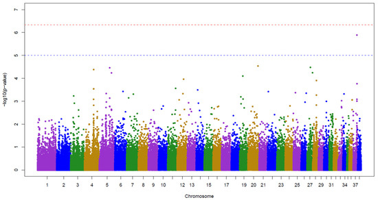 For a more objective assessment of the phenotypic categorization of retinal dysplasia in positive samples, a transformation to a quantitative trait was performed by regression. The regression model included a linear and quadratic fit of the relative value of the damage to the eye and a linear and quadratic fit of the number of lesions. The Restricted Maximum Likelihood (REML) method was used to estimate the variance component by incorporating SNP information obtained after qualitative correction. Subsequently, the BLUPF90 software package [12,13] with genomic capabilities was used, incorporating the use of the preGSf90 genomic preprocessor to combine genomic and pedigree relationships, genomic quality control, removal of SNPs from chromosomes, and deposition of pure SNPs, continuing with the use of the BLUPF96 genomic module to generate an animal solution with genomic information and the postGSf90 genomic postprocessor to extract SNP solutions after genomic evaluations. A conservative Bonferroni-corrected genome-wide significance threshold of 4.63 × 10−7 was calculated, correcting for the number of all autosomal variants remaining after quality control (n = 108,070). A suggestive significance threshold was set at the standard p-value of 1.0 × 10−5. The Manhattan plot was generated using R program code [14]. The same linear animal model (one random effect of animals with pedigree and SNP information) was used for all analyses and estimations.