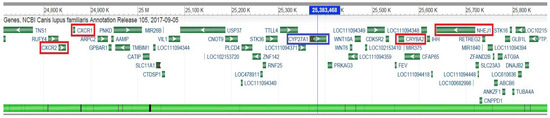 The overview of the entire region demonstrates the position of BICF2G630130992 in the CYP27A1 gene which was identified as a tentative association with retinal dysplasia in the population of 36 samples of the Czechoslovakian Wolfdog. The CYP27A1 gene position is illustrated with a blue frame and the BICF2G630130992 is highlighted by the blue axis with the position 25,383,468. The other genes such as CXRC1, CXRC2, CRYBA2, and NHEJ1, associated with the development of the eye, localised up to ∼ 1 Mb downstream and upstream of the CYP27A1 gene are shown by the red frame. The graphics of the genomic area are from the ENSEMBL website based on the CanFam3.1 assembly (https://www.ncbi.nlm.nih.gov/gdv/browser/genome/?id=GCF_000002285.3) (accessed on 4 December 2024).