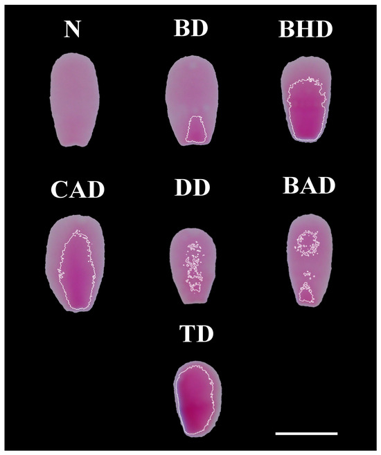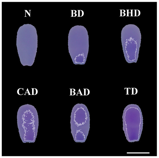 Different types of chromatin decompaction of sperm stained with TB. (N) normal; (BD) base decompaction; (BHD) basal half decompaction; (CAD) central axis decompaction; (BAD) base–apex decompaction; (TD) total decompaction. Scale bar: 5 μm.
