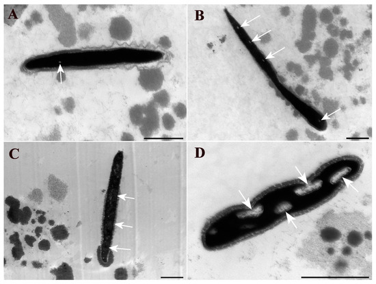 Electron micrographs of bovine sperm heads. (A) Observed grade chromatin integrity alteration is G1, characterized by the presence of up to three small clear spots in the chromatin; (B) grade chromatin integrity alterations G2, characterized by the presence of up to six small clear spots or a clearer region occupying up to ¼ of the head; (C) grade chromatin integrity alterations G3, characterized by the presence of several clear spots (more than six) or a clearer region occupying up to half of the head; (D) grade chromatin integrity alterations G4, characterized by the presence of a clearer nuclear area occupying more than half or large, totally clear regions. Areas with chromatin alterations are indicated by white arrows. Scale bar: 1 μm.