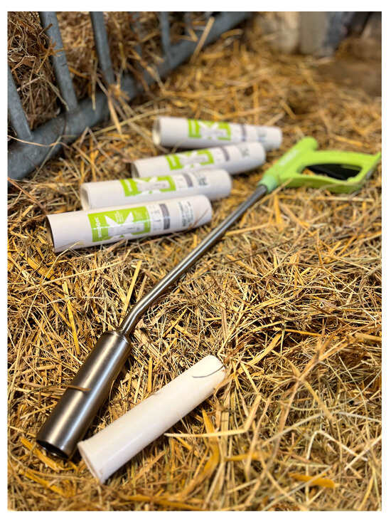 At the beginning of the trial, each of the 71 cows received an orally applicated SmaXtec bolus within the first 30 days after their calving. The boluses were introduced into the reticulorumen using a specialised applicator device, following the manufacturer’s instructions. Prior to application, each bolus was activated and cross-referenced with the ear tag number of the respective cow (Figure 1). A connection was also established with the base station. The SmaXtec boluses recorded the changes in various parameters, such as reticulorumen pH, temperature, and walking activity, enabling the in-line monitoring of this data. Initially, pH calibration was performed using buffer solutions with pH values of 4 and 7, provided by Reagecon (Shannon, Ireland). The data were recorded at ten-minute intervals daily. The SmaXtec Messenger® software compiled and presented all the gathered information.