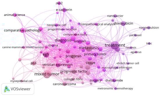 The most prominent terms, such as mammary tumor, dog, mammary carcinoma, mouse, treatment, mixed tumor, human breast cancer, antitumor activity, comparative pathology, animal science, prognostic factors, veterinary medicine, histopathological analysis, and metastasis, reflect the predominant focuses of the scientific investigations (Figure 1). These terms demonstrate how different areas of study are interrelated, emphasizing the complex and interconnected structure of the group’s research.