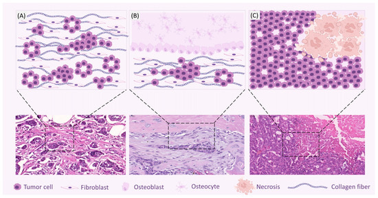 Graphic representations and photomicrographs of the most frequent histological types in humans, canines, and felines. (A). Invasive carcinoma (human). (B). Carcinoma in a mixed tumor (canine). (C). Cribriform carcinoma (feline). Created with BioRender.com (accessed on 16 February 2025).