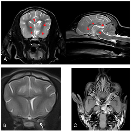 A 5-month-old, female, 5 kg, mixed breed was presented to Anicura Albano Small Animal Hospital for evaluation of depressed mental status, pyrexia (40.5 °C), and neck pain. The clinical signs began one day prior to presentation (day 2). The physical examination confirmed the dog’s depressed mentation and neck pain but not pyrexia (38.2 °C). In the neurological examination, the dog showed depressed mentation, head turn to the left, compulsive walking, and circling to the left. The postural reactions were decreased in the right thoracic and pelvic limbs, with intact spinal reflexes. The menace response was depressed bilaterally, and there was bilateral positional ventral strabismus. Based on the results from the neurological examination, the neurolocalization was consistent with an intracranial multifocal lesion involving the thalamus and/or left forebrain.
