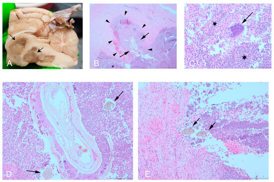 Gross pathology and histopathology of the brain. Gross examination demonstrating multifocal-to-coalescing purulent areas (arrows) in the white matter of the central and caudal parts of the brain (A). Histopathology of the thalamus, adjacent to the hippocampus, demonstrating plant material (arrows) in the centre of a pyogranuloma (arrowheads). The pyogranuloma was primarily composed of neutrophils but also macrophages, H&E20× (B), and H&E100× (D). Numerous bacterial colonies (arrows) at the centre of a pyogranuloma in the left thalamus. Note the surrounding severe inflammation consisting of neutrophils and macrophages (stars), H&E200× (C). Foreign material of a plant origin (arrows) surrounded by pyogranulomatous inflammation and haemorrhages in the left mesencephalon, H&E100× (E).