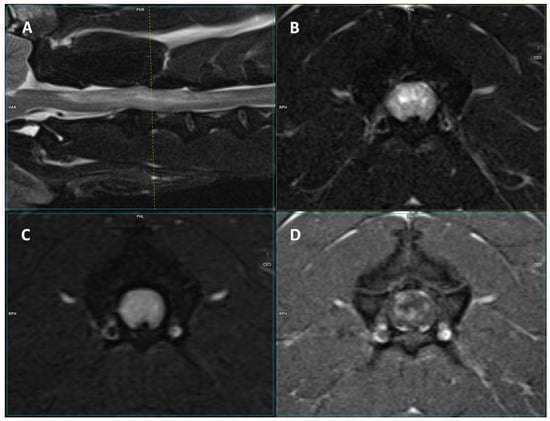 Images of a 3-T MRI study of a 5-year-old male French Bulldog. (A) Mid-sagittal T2-W, (B) T2-W transverse, (C) FLAIR, and (D) T1 post-contrast transverse images of the cervical spinal cord. At the level of C2–C4, there is a diffuse, cloudy T2-W and FLAIR hyperintensity that displays inhomogeneous contrast enhancement.