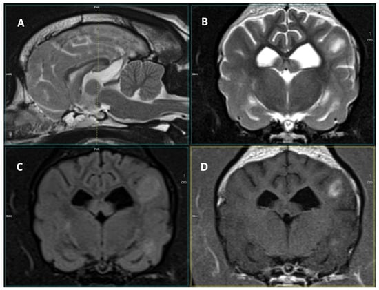 Images of a 3-T MRI study of a 5-year-old male French Bulldog. (A) Mid-sagittal T2-W, (B) T2-W transverse, (C) FLAIR, (D) T1 post-contrast transverse images of the brain. At the level of the caudal margin of the interthalamic adhesion, in the left parietal and temporal regions, there are diffuse T2-W and FLAIR hyperintense lesions with cloudy margins. They display clear, inhomogeneous contrast enhancement. In addition, partial obliteration of the sulci is observed in correspondence to the lesions.