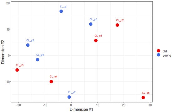Both a principal component analysis (Figure S3) and the Euclidean distances calculated from the rlog-transformed read counts of the samples (Figure S4) led to very similar observations, and neither of these two additional analyses could successfully differentiate the age groups. Thus, these analyses support the multidimensional scaling, that age was not the primary source of variation observed in the per-gene read counts.