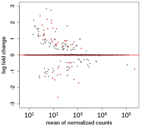 MA plot indicating the read counts and fold changes of all expressed genes in the samples. The differentially expressed genes are shown in red. Black dots are the insignificant genes. The red line indicates a 0-fold change.