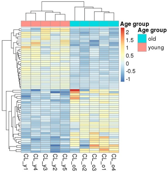 We identified 61 differentially expressed genes, representing just 0.5% of all expressed genes. Of these, 31 were downregulated, and 30 were upregulated in old dogs compared to young dogs (Figure 3). The fold change in the significant genes ranged from 0.5 to 5.6. Clustering the sequenced animals based on the gene expression profiles of these differentially expressed genes clearly separated the two examined age groups, in contrast to the earlier analyses (e.g., MDS; Figure 1), which used normalized read counts of all expressed genes. (List of all differentially expressed genes together with additional information—such as gene biotype and gene version—from the reference annotation are available in Table S2). An identical differential gene expression analysis on both sex and neuter status resulted in no differentially expressed genes.