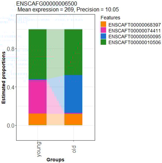 A total of 32,739 transcripts across 16,666 genes were detected using Salmon, with an average of 1.9 transcripts per gene. The differential transcript usage analysis identified a very limited number of genes (n = 30) with significant shifts in transcript usage between the young and old cohorts (see example in Figure 4). This number is comparable to the range of differentially expressed genes identified.