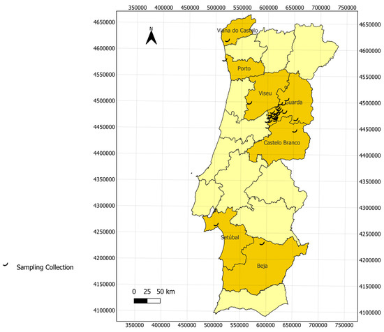 Geographical distribution of guano samples collected in Portugal. Dark yellow represents the districts were the samples were collected from and light yellow the remaining districts of mainland Portugal.