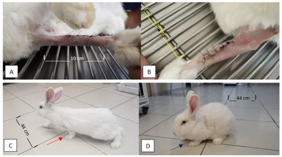 Photographic images of the limbs of the rabbits a few days after the immediate postoperative period and later at 120 days after the surgical procedure. Note the alignment of operated limbs and absence of edema, swelling, redness, signs of inflammation/infection, or foreign body reaction (A,B) at five days PO. In (C,D), note the good support of the thoracic limbs and load placement on the left thoracic limb at 120 days PO (red and purple arrows in (C) and (D), respectively).