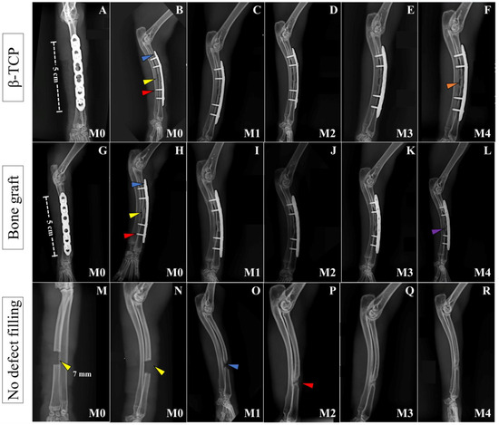 Postoperative radiographic images of the left forelimbs of animals in Groups A, B, and C, respectively, at moments M0 to M4. Craniocaudal images at immediate PO (M0) (A,G,M) and mid-lateral images at immediate PO (M0), and 30 (M1), 60 (M2), 90 (M3), and 120 days (M4) PO (B–F, H–L, N–R, respectively) of animals from Group A (β-TCP), Group B (Bone Graft), and Group C (no defect filling). In both groups with defect filling, note the ceramic implant and bone graft inserted at the ostectomy site (yellow arrow on (B,H)), the 1.5 mm titanium plate (blue arrow in (B,H)), and the 1.5 mm titanium screws (red arrow in (B,H)). In (F), at M5, the integration of the implant and bone cannot be confirmed (solid orange arrow) because of the radiotransparent lines between the bone and the implant, despite its perfect positioning. In (L), at M4, it is possible to notice the integration between the bone and the graft, with the beginning of bone remodeling at the bone critical defect site (solid purple arrow). In (M,N), at M0, we can see the ostectomy site, which is 7 mm in length (yellow arrows). In (O), at M1, there is initial growth of bone inside the defect (blue arrow) that increases until (P) at M2 (red arrow). From that moment, it seems that the bone growing process stops, since the image inside the defect is the same for the next 60 days (P–R) from M2 to M4.