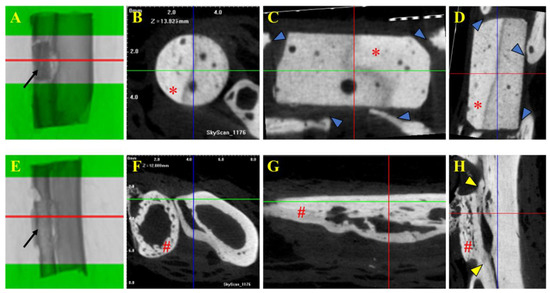 Tomographic images of selected fragments of animals from Group A (β-TCP; (A–D)) and Group B (cortical allogeneic bone graft; (E–H)). Tomographic images of 2 cm bone with β-TCP implant (Group A) and bone graft (Group B). (A,E) Middle part of the implant and graft as region of interest (ROI) for μCT analysis and acquisition of cross-sectional images. Note the implant and bone graft inserted in the receptor bones (black arrows in (A) and (E), respectively). (B,F) Trans-axial cut. (C,G) Coronal cut. (D,H) Sagital cut. * β-TCP implant. # Allogenous cortical bone graft. Note that there is no implant–bone osteointegration seen in μCT images of Group A (blue arrows in (C,D)), but on the contrary, there is positive osteointegration between the bone graft and bone, as shown in (H) (yellow arrows).