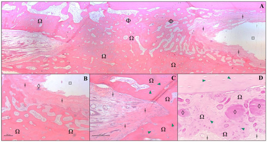 Histological analysis of a section of bone fragment/graft from an animal from Group B, 120 days after receiving an allogenous cortical bone graft. Protocol using hematoxylin and eosin in a decalcified bone fragment. (A) Photomicrography of grafted region at ×2.5 magnification. In the image, we can see a newly formed osteoid matrix (Ω) surrounded by bone lamellae (Φ), adipose tissue (¤), and fibrous connective tissue (ǂ). (B) At higher magnification (×10), a delicate demarcation is observed between the fibrous connective tissue (ǂ) surrounding the bone graft remnants (◊) and newly formed osteoid (Ω). (C) At ×20 magnification, fibrous connective tissue (ǂ) is observed to closely adhere to the newly formed osteoid (Ω), which is rich in osteocytes (green arrowhead). (D) Higher magnification of the allograft region (×20) reveals a moderate presence of amorphous and intensely eosinophilic residues (◊), surrounded by newly formed bone matrix/osteoid (Ω) with prominent osteocyte activity (green arrowhead), as well as fibrous connective tissue (ǂ).