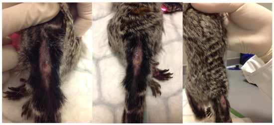 MWS is characterized by a generalized deterioration of body condition. Affected marmosets are reported to have a variety of clinical signs, including skeletal muscle atrophy, marked progressive weight loss, chronic or intermittent diarrhea, and alopecia (especially at the tail) (Figure 1), among other signs, or may result in acute death [,,,,,,,]. Associated clinical signs also include weakness and paralysis of the hind legs, wet or greasy fur, and a failure to thrive. MWS may present with concurrent musculoskeletal disease that may cause pain or result in pathologic fractures [].