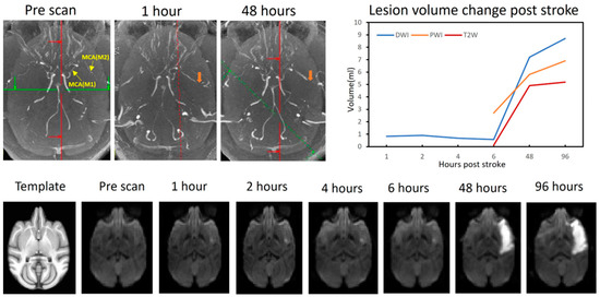 DTIs were pre-processed with FSL (https://fsl.fmrib.ox.ac.uk/fsl/docs/, accessed on 1 October 2015) at each time point. Lesion volumes were determined from diffusion-weighted images (DWI) by applying a threshold of mean + 2 × standard deviation to the DWI intensity on the contralesional side. Lesion volumes from the T2-weighted images (T2W) and perfusion-weighted images (PWI) were obtained through manual tracing. DWI infarct volumes were estimated using custom-built Matlab scripts. Lesion volumes for each measurement were estimated by summing the lesion area on each slice of the corresponding images and multiplying by the slice thickness (Figure 1) [7,12].