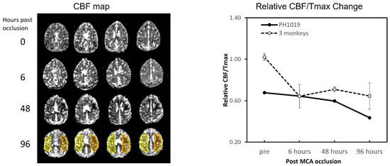 Compared to the other three monkeys with MCA occlusion, monkey PH1019 exhibited significantly lower relative CBF/Tmax at prescan. Additionally, the low relative CBF/Tmax indicated a progressive decrease from 6 h to 96 h post-stroke, with no apparent recovery trend observed as in the other three monkeys (Figure 2, right).