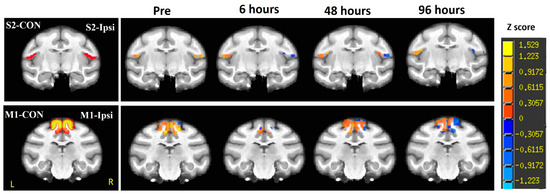 Our previous study identified progressive alterations in functional connectivity (FC) in the S2 of monkeys in the same cohort during acute stroke [12]. In the S2 and M1 seeded FC maps, the FC alterations (Figure 3) between the contralesional and ipsilesional hemispheres in the monkey exhibited similar patterns in the first 6 to 48 h after the stroke, in agreement with those observed in our previous FC study of the same cohort [12]. Specifically, the FC between the contralesional and ipsilesional S2 and M1 regions of the monkey decreased immediately following the stroke but showed slight recovery by 48 h [12], suggesting a rapid response in the FC of S2 and M1 during acute stroke. In contrast to the FC studies of stroke patients [28,29], our monkey results indicate that recovery effects emerge at an early stage (48 h post-stroke) in both S2 and M1 areas, suggesting that early sensory and motor compensation may facilitate the recovery process.