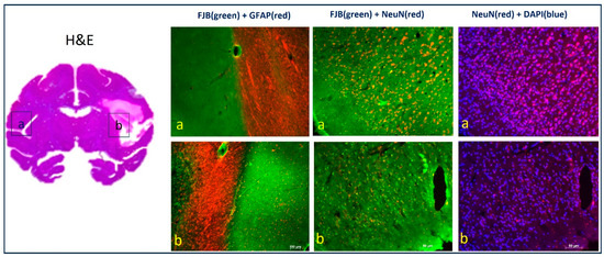 The brain was carefully extracted and fixed in 10% buffered formalin [7,12] after the animal was euthanized with pentobarbital (i.v., 100 mg/kg) while anesthetized. Then, the brain was blocked and sectioned into 50 µm slices using a freezing microtome. Selected sections were processed with hematoxylin and eosin (H&E) [16], and immunohistology protocols which were modified based on the previous protocols used in rodents [17], using the antibodies such as glial fibrillary acidic protein (GFAP; Cy3-conjugated anti-GFAP, 1:500, C9205, Sigma, Kanagawa, Janpan) and NeuN (neuronal nuclei; anti-NeuN 1:200, MAB314, Millipore, Billerica, MA, USA), followed by Fluoro-Jade B (FJB, AG310, Millipore, Billerica, MA, USA) or DAPI (4′,6-diamidino-2-phenylindole, D9542, Sigma) staining (Figure 4).
