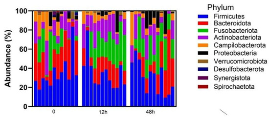 When evaluating the top 10 phyla, significant differences were observed following the LGC-containing probiotic treatment. The taxonomic abundance of Fusobacteriota was seen to increase significantly between time 0 and 12 h post-treatment (p = 0.035, Figure 3), while the Proteobacteria increased significantly from 12 h to 48 h post-treatment (p = 0.008, Figure 3). Desulfobacterota and Sinergistota were observed to decrease from pre-treatment values (Figure 3) at time 12 and 48 h post-treatment (Desulfobacterota, p = 0.041 and p < 0.001, respectively) and 48 h post-treatment (Sinergistota, p < 0.001).