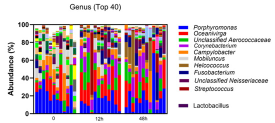 Taxonomic diversity between the groups, as determined by PERMANOVA, was unchanged between timepoints 12 and 48 h post-treatment. However, significant differences in beta diversity were apparent between time 0 and 12 h post-treatment (p adjusted: 0.005) and time 0 to time 48 h post-treatment (p adjusted: 0.003). A principal coordinate analysis (PCoA) plot shows the beta diversity relationships between the samples by sampling timepoints (Figure 6).
