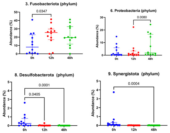 Quantification of relative abundance for Fusobacteriota, Proteobacteria, Desulfobacterota and Synergistota phyla before and after treatment with LGC-containing probiotics. Time 0 = pre-treatment, 12 h = 12 h post-LGC treatment, 48 h = 48 h post-LGC treatment. Solid line with p value identifies significant differences. Numbers in figure titles are indicative of phylum overall abundance.