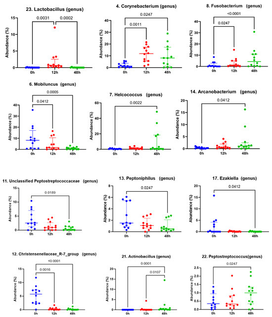 Quantification of relative abundance for significantly different genera before and after treatment with LGC-containing probiotics Lactobacillus, Corynebacterium, Mobiluncus, Fusobacterium, Helcococcus, Arcanobacterium, unclassified Peptostreptococcaceae, Christensenellaceae R-7 group, Peptinophilus, Ezakiella, Actinobacillus, Peptostreptococcus. Time 0 = pre-treatment, 12 h = 12 h post-LGC treatment, 48h= 48 h post-LGC treatment. Solid line with p value identifies significant differences.