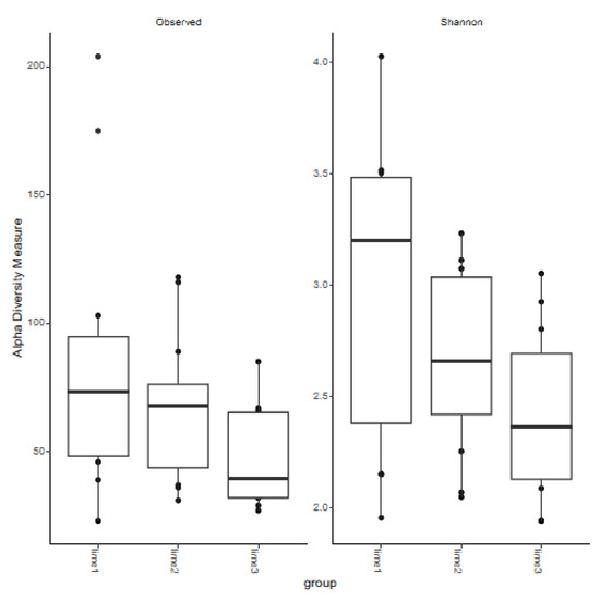 Box and whisker plots of observed and Shannon diversity indices within the equine clitoris before and after LGC-containing probiotic treatment. Time 1 = pre-treatment, Time 2 = 12 h post-treatment, Time 3 = 48 h post-treatment.