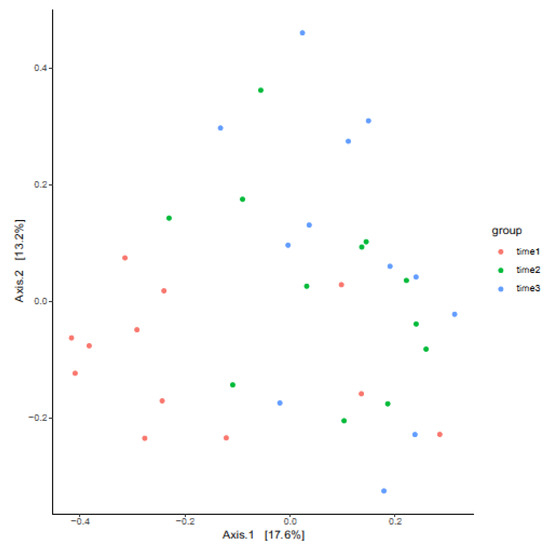 PCoA plot of beta diversity relationships between equine clitoral samples before and after LGC-containing probiotic treatment. time 1 = pre-treatment, time 2 = 12 h post-treatment, time 3 = 48 h post-treatment.