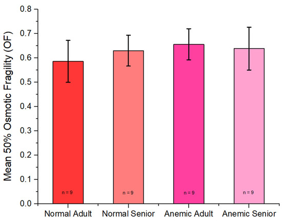 Mean 50% osmotic fragility (OF) of the normal adult, normal senior, anemic adult, and anemic senior groups. Error bar represents SD.