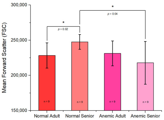 Mean forward scatter characteristics (FSC) of the normal adult, normal senior, anemic adult, and anemic senior groups. Error bar represents SD. * Statistically significant (p-value < 0.05).