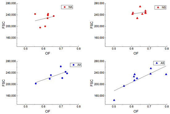 Linear regression analyses demonstrated the relationship between osmotic fragility and the forward scatter characteristic of each group, revealing a statistically significant positive correlation in the anemic senior group (AS), with p = 0.0103, r = 0.79, and R2 = 0.58, as shown in Figure 4.
