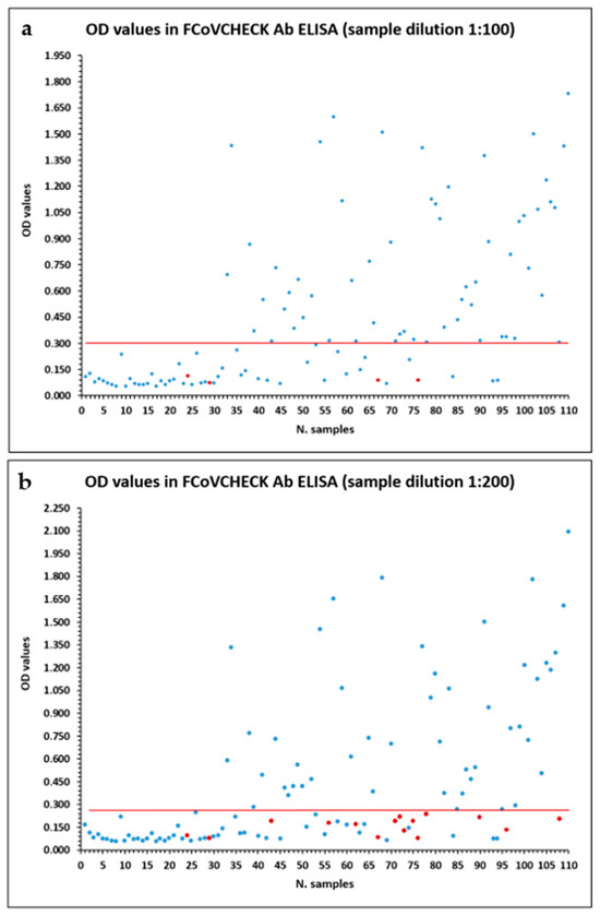 Overall graphs of OD values obtained by sample dilution 1:100 (a) or 1:200 (b). Red dots indicate the discordant false-negative data in ELISA compared with the reference IFAT method. The red line corresponds to the OD cut-off level that best separates positive and negative samples.