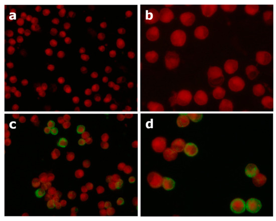 Example of negative (a,b) and positive (c,d) test results in IFAT observed at 100X (a,c) and 400X magnification (b,d).
