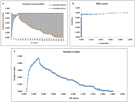 The ELISA cut-off was determined by comparison of several methods. Initially, it was calculated as the mean OD value of negative samples multiplied by 3 or 4, as described in reference [26], then confirmed through other methods, as well. In one of these, the cut-off was calculated as the mean OD value of negative samples plus 3 times the standard deviation (SD) [26,27,28], considering positive or negative samples with the OD above or below the cut-off, respectively. Samples with OD values within 10% of the cut-off value were considered “doubtful”, as reported in other commercial ELISA assays [29,30]. Moreover, another common method was based on the evaluation of sensitivity and specificity parameters, according to which the best cut-off would be the OD value where the difference between them is smallest [31]. In addition, based on a study present in the literature [26], the optimal cut-off may also be a value between the maximum OD value of negative samples and the minimum OD value of positive samples. Furthermore, the receiver operating characteristics (ROC) curve was evaluated to measure the accuracy of the diagnostic test and to identify the optimal cut-off value that maximizes the difference between true positives and false positives. The ROC curve was constructed by joining the points obtained from the proportion of true positives (sensitivity) and false positives (1-specificity) at all possible cut-off values. The point closest to the upper left corner of the ROC curve usually corresponds to the best cut-off. Closely related to the ROC curve method is the Youden’s index (J), which was calculated for each individual cut-off by Formula (4):