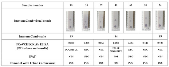 The FCoVCHECK Ab ELISA agreed with the ImmunoComb test kit at 93.6% (Cohen’s kappa: 0.872, very good agreement). Of 110 samples tested, the ImmunoComb assay detected 45 negatives and 65 positives, including seven false-positive samples (n. 15, 23, 33, 39, 46, 54, 63) (Table 6). Among these seven samples, six were negative and only one (n. 46) was positive in IFAT. Instead, six of these seven samples were positive, and one was negative (n. 15) with the INgezim Corona Felino ELISA. Therefore, we concluded that sample n. 46 was probably a false negative in FCoVCHECK Ab ELISA, and sample n.15 was a false positive in ImmunoComb (Figure 5). In addition, 19 samples resulted in negatives in FCoVCHECK Ab ELISA, but had weak positives (borderline) with a score S2 in ImmunoComb. Among these, only one sample (n. 37) was positive in IFAT. Thus, in addition to sample n. 46 identified previously, n. 37, although with a weak positive in ImmunoComb, could also be a false negative in FCoVCHECK Ab ELISA.