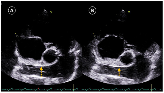 The determination of the presence of PH was based on the two different methods of obtaining the RPADi through the use of echocardiographic M-mode and 2D mode, being a value < 30% correlated in both cases with the presence of moderate or severe PH (>50 mmHg) [8,11]. To determine the RPADi using the Visser et al., method [11], the right parasternal short-axis view was applied at the level of the pulmonary trunk bifurcation, clearly observing the progression of the right and left branches. An adequate two-dimensional image with direct visualization of the longitudinal axis of the right pulmonary artery was obtained in all cases. The minimum diastolic and maximum systolic internal diameters were measured with the “trailing edge to leading edge” (te-le) method, using the same location of the right pulmonary artery (RPADVisser). Special care was taken to take measurements of the farthest portion, avoiding including the aorta (Ao) in the image (Figure 1). On the other hand, the determination of the RPADi using the Venco et al. method [8] was based on the right parasternal long-axis view of four cardiac chambers. M-mode was used in this case on the transverse axis of the right pulmonary artery when the left atrium, and pulmonary artery and vein were accurately observed. The right pulmonary artery diameters were measured using the “leading edge to leading edge” (le-le) measurement convention (RPADVenco) (Figure 2). In both cases, systolic diameter was measured at the maximum (T wave) and diastolic diameter at the smallest (Q wave) dimensions. The RPADi was calculated as the percentage difference in right pulmonary artery diameter in systole and diastole, using the following formula: RPADi = [(RPAmax − RPAmin)/RPAmax] × 100, as previously described [10].