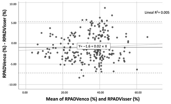 The Bland–Altman representation investigated how the differences between the methods behave (Figure 4). The bias (mean of the differences) between methods was −0.9069 (solid line) with a t-student p-value of 0.000, which meant that on average the RPADVenco and RPADVisser indices did not measure statistically equal values. Approximately 95% of the differences between methods were between −7.1673 (−0.9069 − 1.96 × SD) and 5.3535 (−0.9069 + 1.96 × SD)—dashed lines. The regression line calculated for the differences was practically horizontal and almost overlapped with the bias line, so there was no proportional bias but a constant bias, that is, the cloud of points was distributed quite homogeneously around zero, except for some values below 30 where RPADVisser scored much higher, and some above 30 where RPADVenco scored much higher (points outside the solid lines). In other words, there was no pattern of discordance, but sometimes one index scored higher and sometimes the other, without following any order.