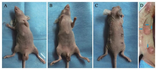 Calf testicular tissues were transplanted on the back of castrated Balb/c male nude mice. (A) Anesthesia; (B) gonadectomy; (C) transplantation of D1 calf testicular tissues and suture; (D) grafts on D28; note the blood vessels around grafts (blue arrows).