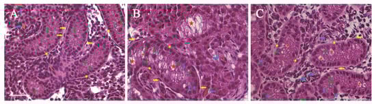 Cryopreserved testicular tissues have a wide range of applications, particularly for the germplasm preservation of humans and animals [,,]. With the continuous improvements in cryopreservation technology, combined with optimized culture systems and transplant techniques, the cryopreservation of testicular tissues lays a foundation for the further study of the spermatogenesis, diagnosis, and treatment of male sterility [,,,]. Generally, viability of the frozen–thawed testicular tissues can be assayed by three methods: (1) isolate and culture viable cells, (2) culture tissue fragments/blocks, and (3) transplant whole tissue fragments/blocks. The third method might be the better protocol to evaluate the histological integrity and entire viability of the frozen–thawed testicular tissues.