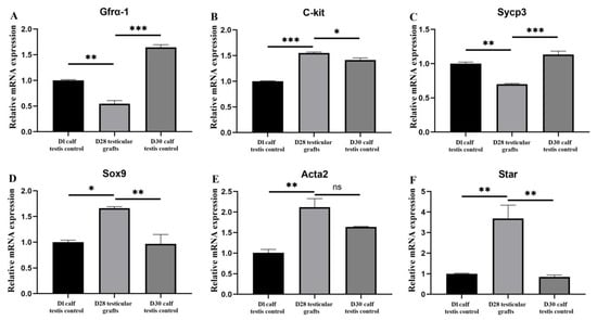 qRT-PCR analysis of the gene expressions in the xenografts. (A) SSC marker Gfrα-1; (B) spermatogenic differentiating gene C-kit; (C) meiotic gene Sycp3; (D) SC marker Sox9; (E) PMC marker Acta2; (F) Leydig cell marker Star; data were presented as mean ± SD, * p < 0.05, ** p < 0.01, *** p < 0.001, and ns = no statistical significance.