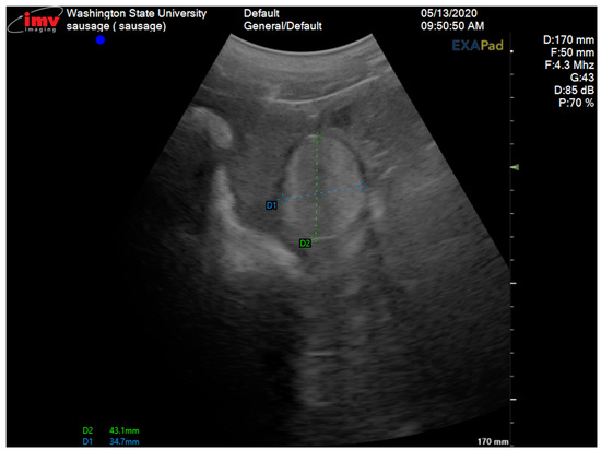 A 2-year-old Large White research gilt was presented to the Comparative Theriogenology service at WSU for infertility. She was delivered via cesarean section in the Spring of 2019, following the transfer of embryos that were generated via in vitro fertilization and electroporated with CRISPR-Cas9 reagents designed to target the NANOS2 gene. The gilt failed to become pregnant after several attempts at artificial insemination. She was a mosaic for the NANOS2 gene involved in an unrelated research project at WSU. Previous studies demonstrated that animals with inactivated alleles for the NANOS2 gene have male-specific sterility due to the neonatal apoptosis of prospermatogonia, but females retain germlines and are fertile [17]. The first estrus was observed at 5 months of age, but was accompanied by aggressive, boar-like behavior. Due to the importance of piglets carrying the mutation of this gilt, artificial insemination was attempted on five occasions after estrus control using altrenogest (Matrix®, Jersey City, NJ, USA) (14 days treatment, 20 mg PO/day). No pregnancy was established after all these inseminations despite the use of satisfactory semen (concentration, motility, and morphology via a Computer-Assisted Semen Analysis (CASA) from a proven fertile boar. Interestingly, the insemination pipette could only be advanced 10 cm into the vagina, which is considerably shorter than the average 25 cm penetration in normal gilts [18]. During the physical examination, the vital parameters were within the normal limits. The only abnormalities observed were an abnormal vulvar conformation (“skyhook” vulva) (Figure 1), a typical external phenotype in gilts affected by DSDs, an excessive stature, and aggressive behavior. Transabdominal ultrasonography revealed a normal uterus and a left ovary with multiple follicles. The right gonad had an unusual echotexture, including a testis-like round structure measuring approximately 4 cm and an adjacent small portion of ovary-like tissue with small follicles (Figure 2). A DSD was suspected, given the animal phenotype and ultrasonographic findings. Karyotyping and a polymerase chain reaction for the SRY-gene were then conducted. The gilt’s genotype was confirmed to be chromosomally normal as 38, XX, and SRY-negative.