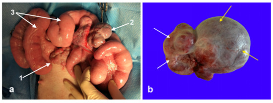 An exploratory laparotomy was scheduled for two weeks after the diagnostic workup. Anesthesia was induced with xylazine (AnaSed LA; VetOne Inc., Boise, ID, USA; 3 mg/kg, IV), ketamine (Ketaset; Zoetis Inc., Parsippany, NJ, USA; 5–10 mg/kg, IV), propofol (Propoflo; Zoetis Inc., Parsippany, NJ, USA; 3 mg/kg titrated, IV), and maintained with isoflurane in O2. Ceftiofur crystalline free acid (EXCEDE®; Zoetis Inc., Parsippany, NJ, USA; 6.6 mg/kg, SQ) and flunixin meglumine (Prevail; VetOne Inc., Boise, ID, USA; 1.1 mg/kg, IV) were administered during the surgery. A standard midline laparotomy was performed. Both gonads and the uterus were exteriorized and evaluated (Figure 3). The uterine horns were grossly normal. The left gonad has a normal ovary appearance with twelve corpora lutea of 5 to 8 mm in diameter. The right gonad consisted of two morphologically distinct parts: one round, smooth mass of 4 cm in size, and the other with four corpora lutea of 4–8 mm in diameter (Figure 3). The abnormal gonad was attached to the right uterine horn by a 1 to 2 cm wide and 6 cm long tubular structure resembling an epididymis. Tortuous vessels were attached to the proximal end of the epididymis-like structure and appeared like the pampiniform plexus. Intra-operatively, the decision was made to excise the abnormal right gonad. The ovarian pedicle was freed from the broad ligament and ligated using the 3-clump approach and a combination of encircling and transfixing ligatures of No. 0 polydioxanone suture (PDS (R)II; Ethicon Inc., Raritan, NJ, USA). The uterus and left ovary were replaced into the abdominal cavity, and the incision was routinely closed. The pig recovered uneventfully and was returned to the research facility. She received meloxicam (meloxicam tablets; Zydus Pharmaceuticals Inc., Solana Beach, CA, USA; 0.4 mg/kg PO q24) to reduce the pain from surgery.