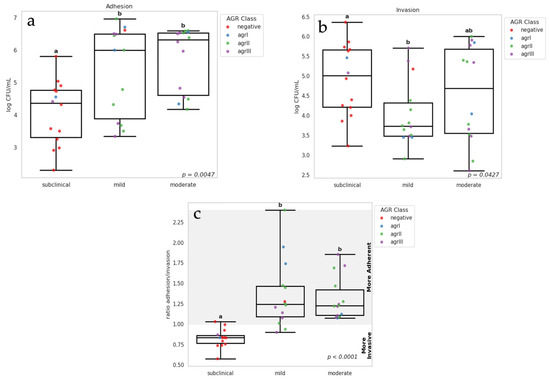 Box Plots showing adhesion (a) and invasion (b) capacity of S. aureus isolates to MAC-T cells. Box plot (c) illustrates the ratio between adhesion and invasion. Isolates with values lower than 1 are considered more invasive, while values higher than 1 indicate higher adhesion capacity. Individual samples are indicated in dots with different colors for each agr class. Different letters indicate significant differences between subclinical and clinical (mild and moderate). p value from Kruskal–Wallis test.